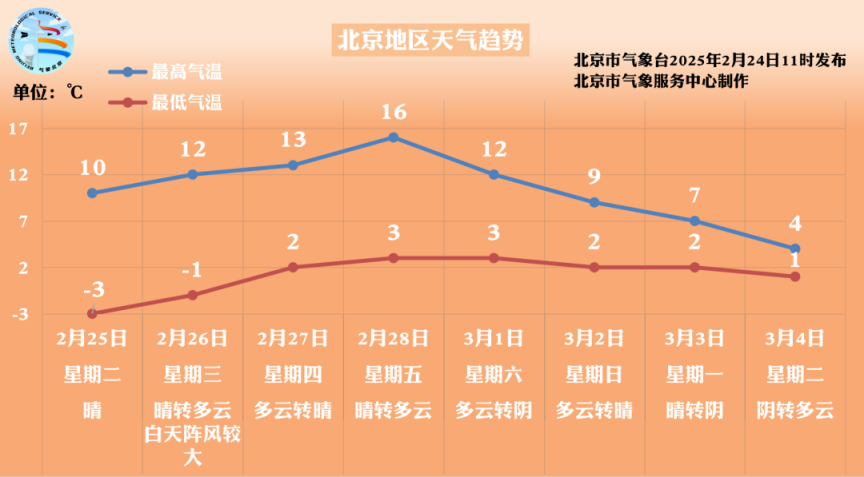 24日日间:晴间多云;北转南风2、3级;平原地区最高气温9℃,山区最高气温7~9℃;最小相对湿度10%。
